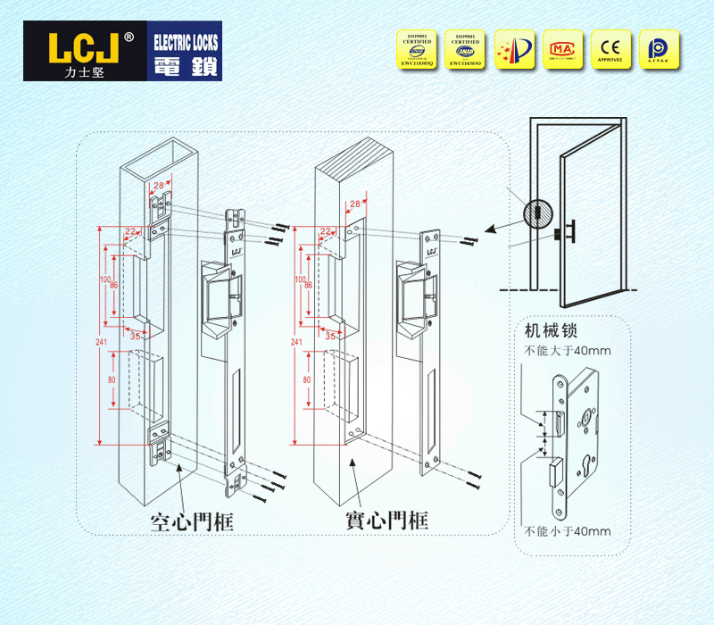 搭配机械锁配套使用,实现智能控制与手动开启双开门工作模式。 断电上锁、通电开锁,保障财产安全,配套机械锁使用,在紧急情况下,可通过机械锁打开,满足消防要求。配套使用的机械锁斜锁舌与方形锁舌之间的距离不能小于40mm。